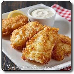 - Dip each piece into the batter, let excess drip off. Slowly lower into the hot Oil. Fry until golden brown and crispy. (3 to 5 minutes)
